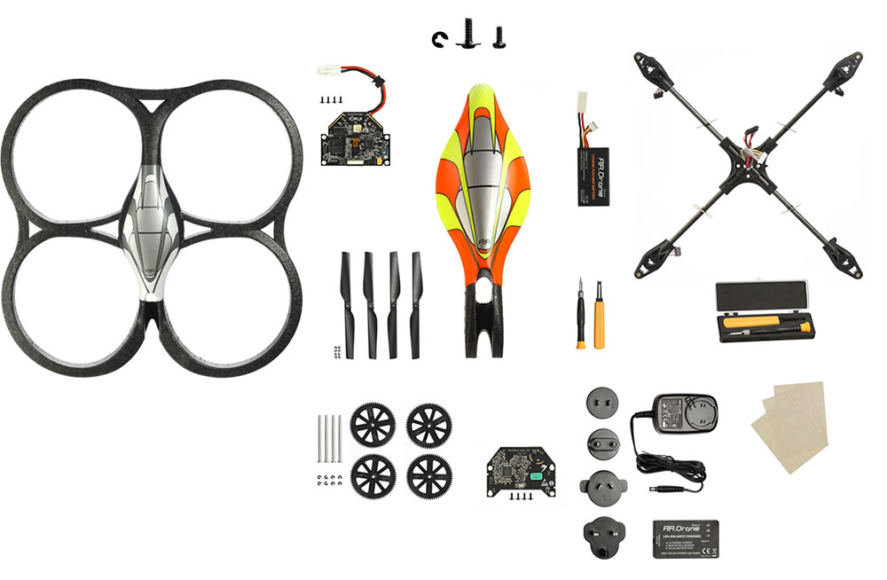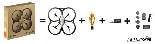ชุดเฮลิคอปเตอร์บังคับ AR Drone ประกอบด้วย : ตัวลำพร้อมบิน, หน้ากากเพื่อบินในร่ม(4 ห่วง), หน้ากากบินนอกบ้าน(มีให้เลือก 3 สี), แบตเตอรี่, เครื่องชาร์จพร้อมตัวแปลงไฟบ้าน
