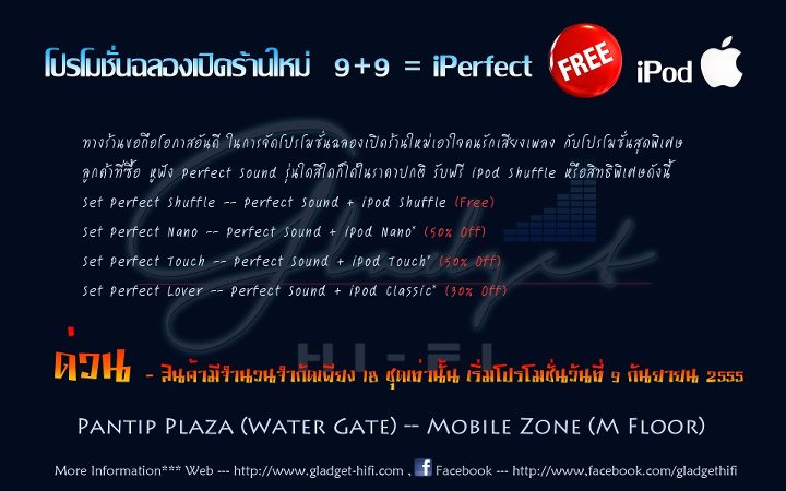 ซื้อสินค้า Perfect Sound รุ่นใดก็ได้ รับฟรี iPod Shuffle หรือรับกันไปส่วนลดสำหรับ iPod Nano, Touch, Classic 30 - 50% ราคาเริ่มต้นที่ 6,590 บาทกับเซ็ทแถมฟรี iPod Shuffle ครับ