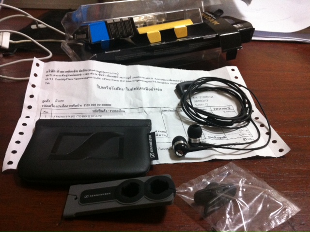 อุปกรณ์มีหูฟัง กล่อง ใบเสร็จ ซองหนัง จุกยาง คลิป และยางพันหูฟัง