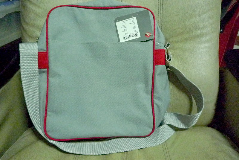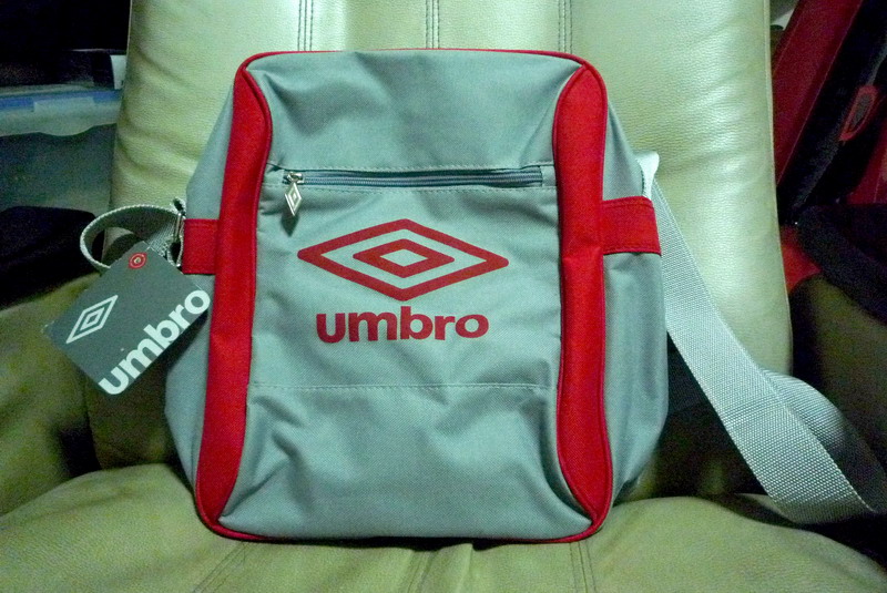 กระเป๋าสะพายข้าง Umbro สีเทาคาดแดง สูง 12.5 นิ้ว กว้าง 10 นิ้ว หนา 4.5 นิ้ว เอาไว้ใส่ iPad ใส่หูฟังฟูลไซส์ ใส่ชุดฟังเพลงทั้ง Player + Amp ได้สบายครับ