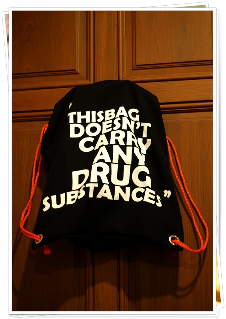 ประมาณว่า " กระเป๋าใบนี้ไม่มียาเสพติด " 55 ดูออกแนวประชด