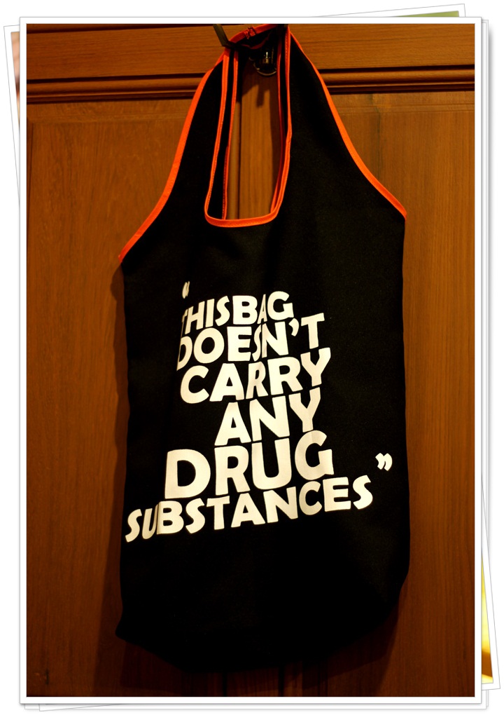 สกรีนลงบนเนื้อผ้าอย่างดีว่า " This Bag Doesn't Carry Any Drug Substances "