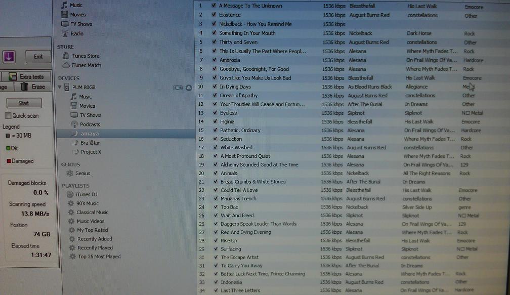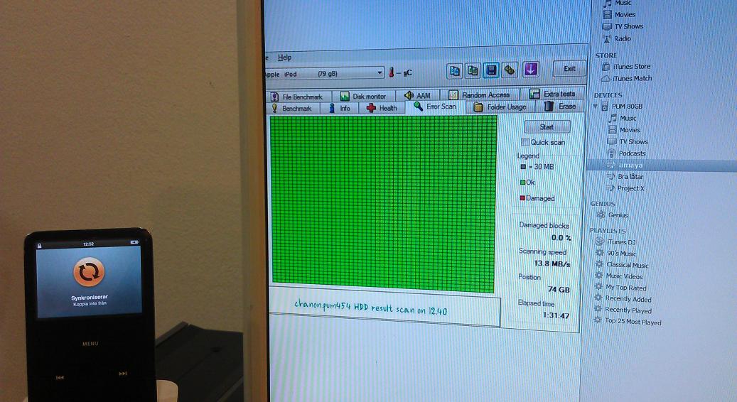 2. Ipod Classic 80GB Black สภาพนอกไม่สวย รอยเยอะ ตามขอบ แต่ไม่บุบครับ อยู่ระหว่าง รอผลสแกน HDD อยู่ ผ่านไป 70% ยังไม่พบ BAD sector ครับ ผมว่าตัวนี้คงผ่านครับ