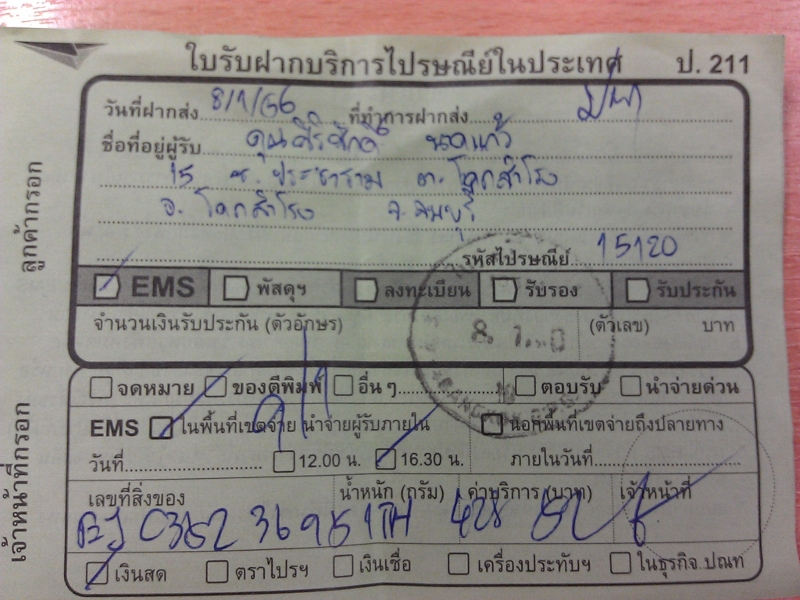 ไม่ต้องกลัวโกงนะครับ ส่งจากที่ทำงานครับ เพราะจะมีไปรษณีย์มาตั้งโต๊ะรับของ แล้วส่งไปที่ที่ทำการไปรษณีย์อีกทีครับ ดังนั้นข้อมูลออนไลน์อาจจะช้านะครับ