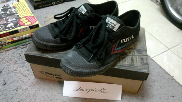 ๖.รองเท้า Feiyue รุ่นพิเศษ สีดำ เบอร์ 42 เพิ่งซื้อมาเมื่อสองเดือนที่แล้ว จาก ZEN ใหม่กริ้บ ใส่บ้างจึงมีรอยเปื้อนฝุ่นประปราย พื้นแทบไม่สึกเลย ขายเพราะมันแน่นเกิน ไม่รู้ตอนลองลองยังไง 5555