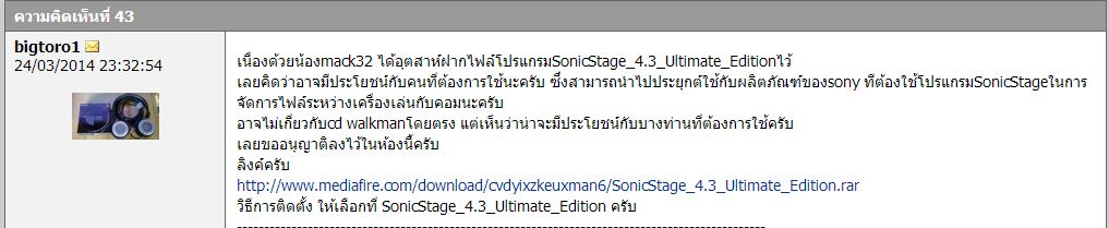 พอดีได้mp3มาครับแต่เจ้าตัวนี้เวลาลงเพราะต้องลงผ่านโปรแกรมครับ เลยหาที่โหลดตามเว็ปต่างมากมายแต่ปรากฎว่ามันเป็นแบบต้องไปโหลดจากlink sony อีกซึ่งทางsony ไม่มีให้โหลดแล้วครับจึงจะรบกวนเพื่อนพี่น้องมั่นคงใครที่แผ่นโปรแกรมวานรบกวนcopyแล้วuploadในเว็ปในทีครับตอนนี้ฟังแต่fm อย่างเดียวเลยเบื่อแล้วครับยังไงรบกวนทีนะครับ