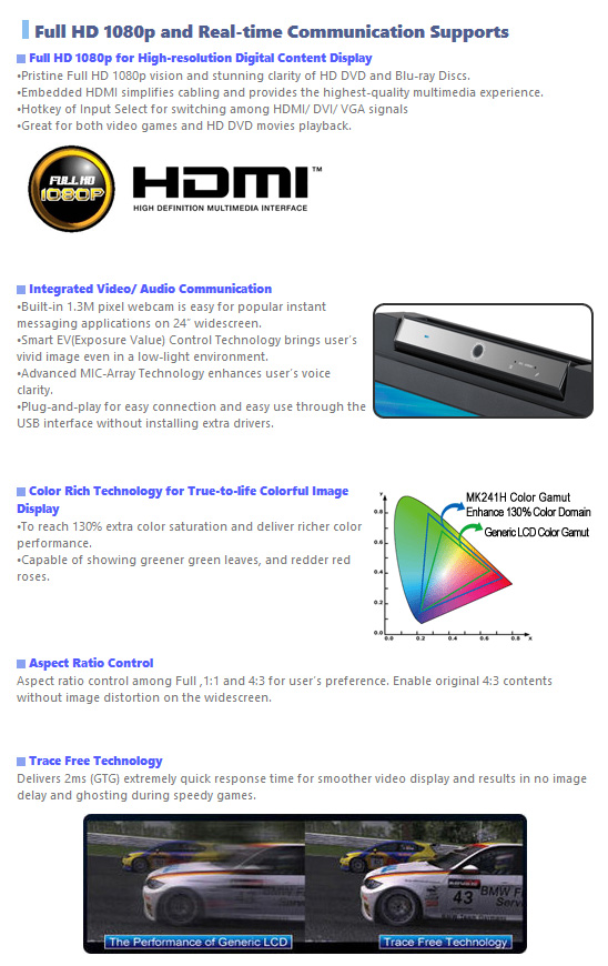 24" Asus MK241H 24in LCD มีกล้องหน้า1.3m/มีลำโพง/มีไมค์/พลาสติกหุ้มฐานและขอบยังไม่ได่แกะ