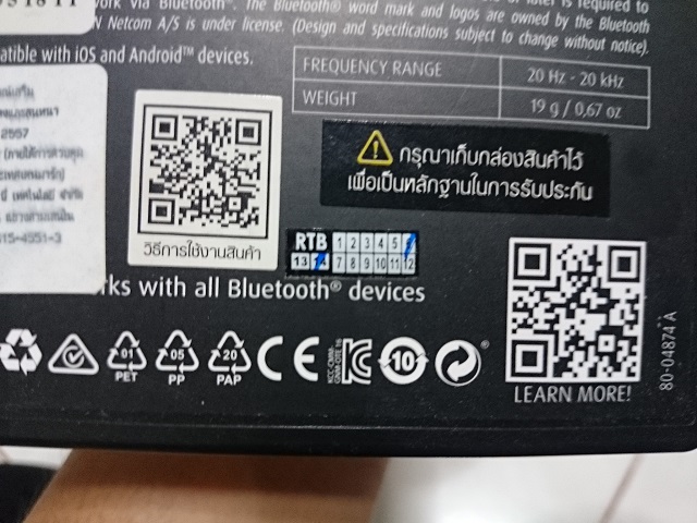 ขายบลูทูธ Jabra Rox Wireless สีดำอุปกรณ์ยกกล่อง ไม่แน่ใจว่าซื้อล็อตแรกหรือยังไง เพราะว่าได้ Ear Wings ไม่ครบ (ได้มาแค่ 2 คู่) มีตำหนิตรงปุ่มเพิ่มเสียง ยางมันเปื่อยมันเลยเผยอออกมานิดนึงตามรูป