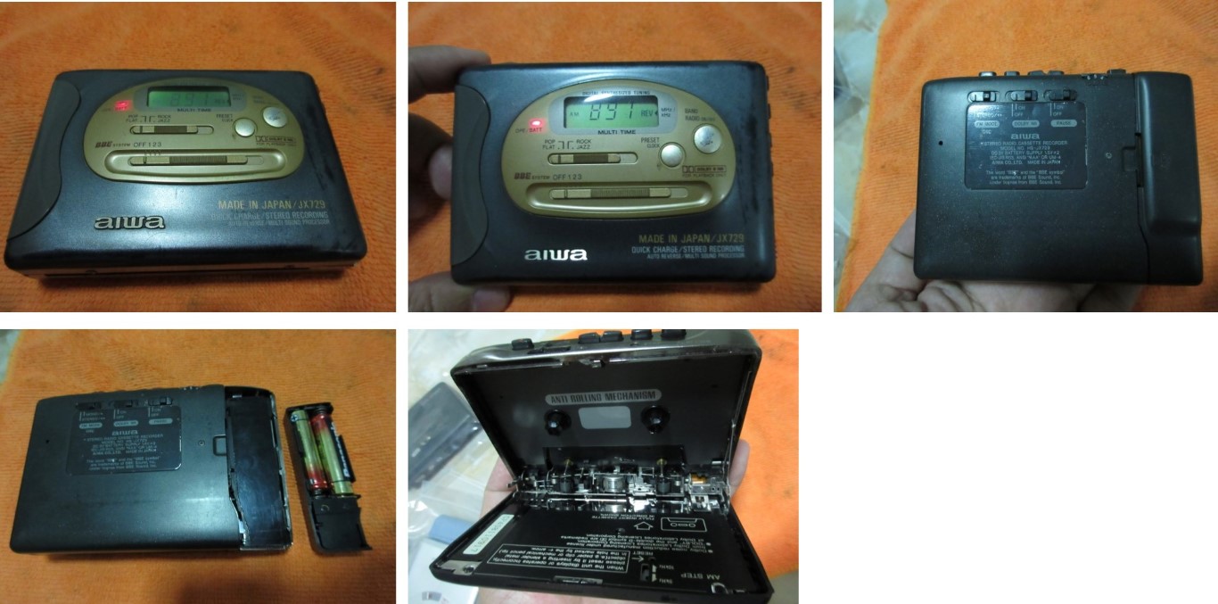 4)AIWA JX729 สภาพไฟเข้า มอเตอร์ไม่หมุน ฟัง AM ได้ FM ฟังไม่ได้ ใช้ถ่าน AAA 2 ก้อน