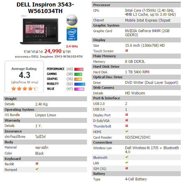 อุปกรณ์ : โน๊ตบุ๊ค Dell Inspiron 3543 จอ 15.6 นิ้ว HD i7 5500u
