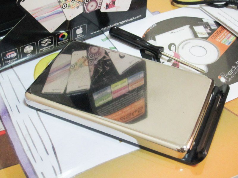 ส่วนครึ่งล่างของกล่องเป็นอลูมิเนียมหนา ยังมีฟิล์มกันรอยที่ด้านล่าง ที่เห็นรอยข่วนขนแมวเป็นรอยที่ฟิล์มครับ