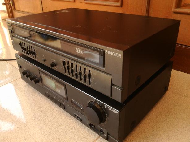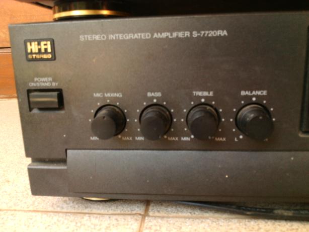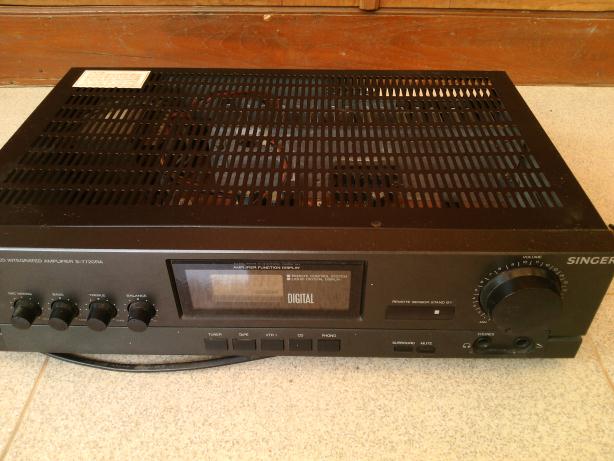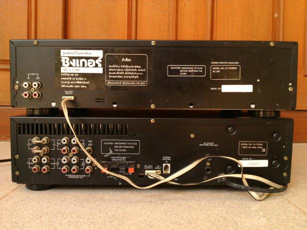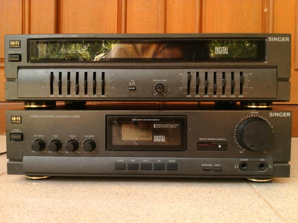 Integated Amplifier รุ่น S-7720-RAพร้อม EQ รุ่น S-7720-RA บริษัท Singer นำเข้ามาขายรุ่นเกือบแรกๆ จากเกาหลี เป็นสมบัติของครูท่านหนึ่งที่ผ่อนด้วยความอยากได้ตอนนั้น (สองหมื่นกว่าๆ) ผ่านกาลเวลาเริ่มเบื่อจึงอยากหาคนดูแลต่อเพราะรักมากใช้ได้ดีทุกฟังก์ชั่น กำลังขยาย 220 วัตต์ ไฟ 220 V โดยตรง ขนาดตัวเครื่อง IntAmp และ EQ เท่ากันเลย กว้าง 26 cm ยาว 42 cm สูง 10 cm ส่วน EQ เท่ากันทุกประการ ที่ 50 Hz ขับลำโพงขนาด 100 วัตต์(RMS) สบายเหลือๆ มีปรีปรับ Bass Treble balance หากจะต่อดูหนังก็มีฟังก์ชั่น Surround ด้วย มีภาค phono , tuner Am-Fm ,มี EQ in-out และช่องออก Surround ด้วยนะครับ ใช้ได้ดีทุก อย่างครับ มีสาย Audio in ก็ฟังเพลงได้เลยครับชุดนี้รับรองครบครับแถมประหยัดเงินมากในราคาที่สมัยก่อนใครมีไว้สุดยอดเลยครับ(เป็นของครูเพื่อนกันนะครับขอคนที่อยากดูแลต่อจริงๆ ท่านบอกมาอย่างนี้เพราะรักและผ่อนนานมากกว่าจะได้มาครอง...มันแพง)