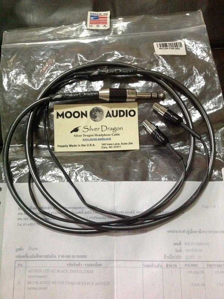 ในชุดจะมี สายอัพเกรด Moon Siver Dragon V3 Premium For Audeze มีใบเสร็จของทางร้านมั่นคง ซอง นามบัตรของทาง Moon Audio โดยที่สายจะมีความยาว 5 ฟุต มีหัวเป็นคาร์บอนไฟเบอร์และโรเดียม (ตามรูป)