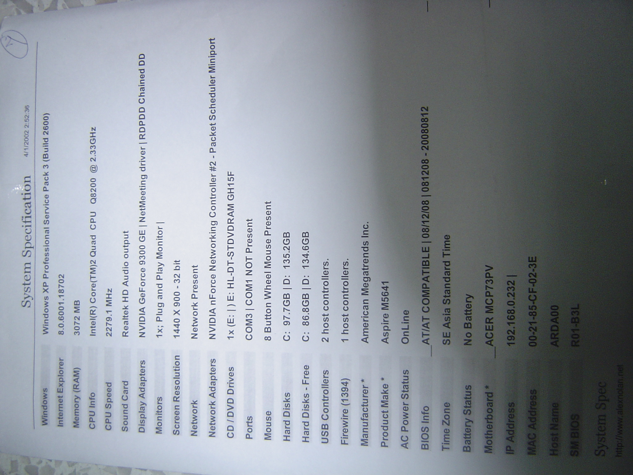 Memory 4 GB , HDD 500 GB ,DVD-RW ,Card reader