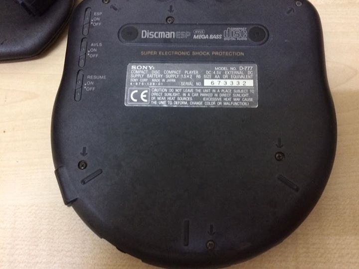 1, Sony D-777 ภายในเล่นแผ่นปกติ. ภายนอกมีรอยฝาแตก. เนื่องลำโพงล้มมาทับ เสียงดีมาก ไหลลื่น อ่านแผ่นไรท์ได้(ไง งงเหมือนกัน). อุปกรณ์มี รีโมท รางถ่าน ซองหนัง อแดปเตอร์. ต่อตรงไฟบ้านเราได้