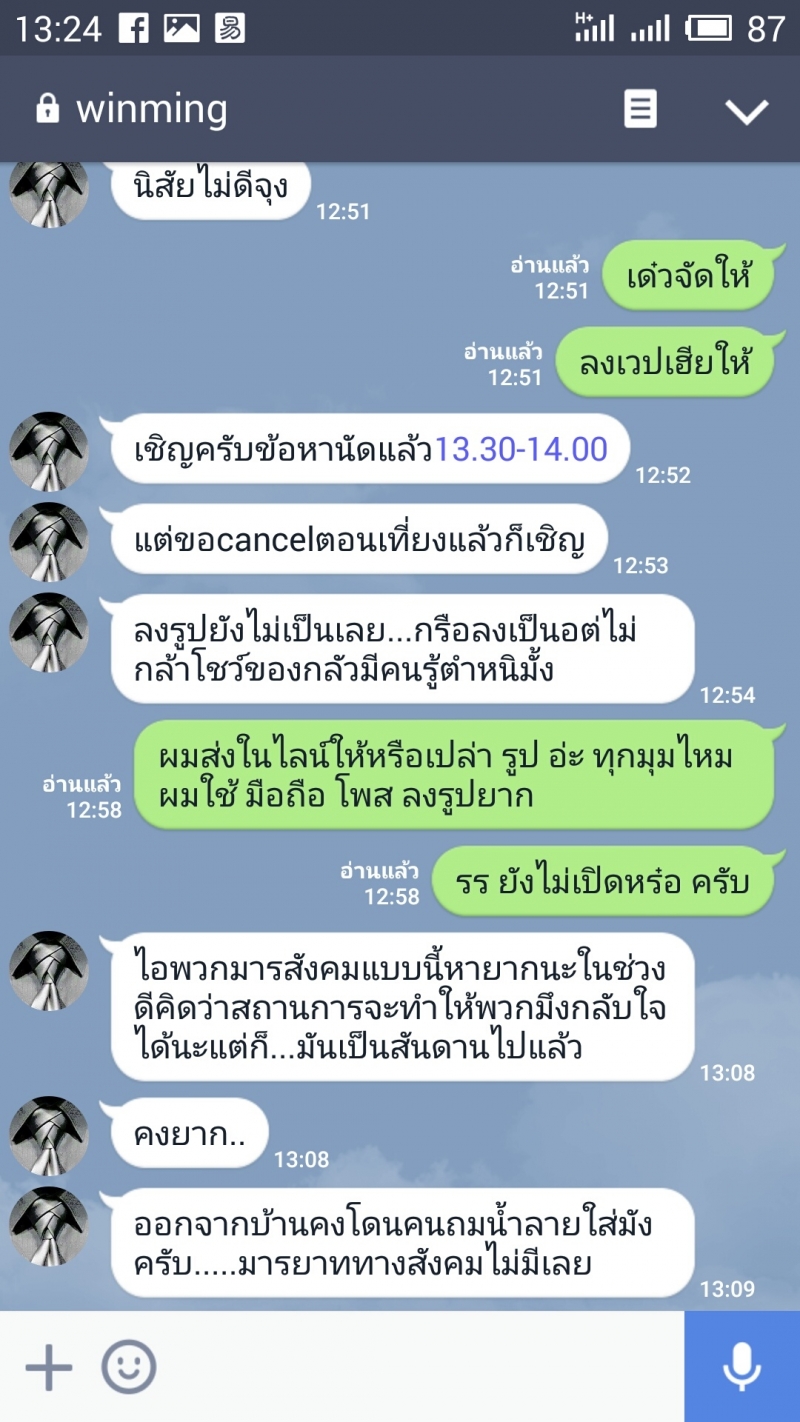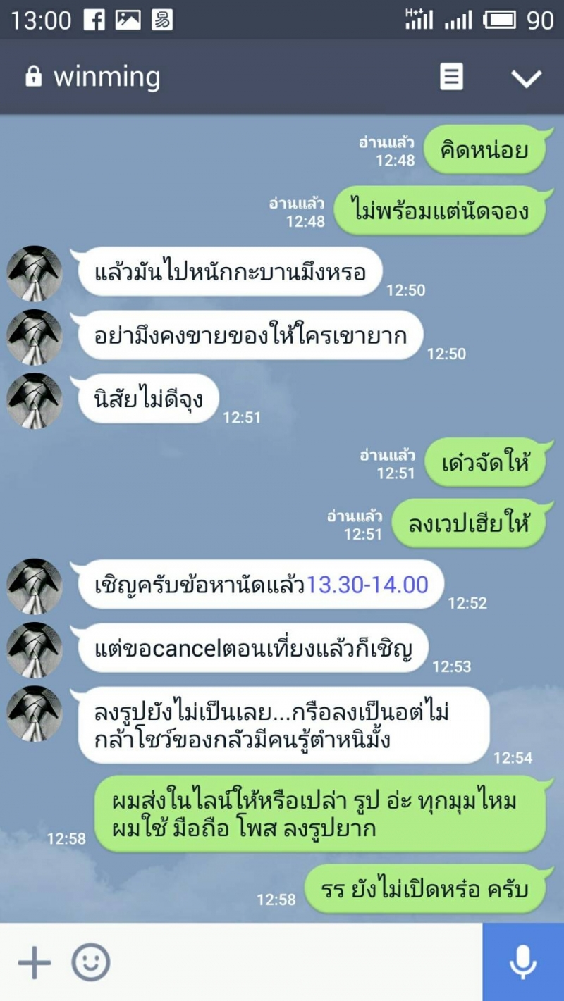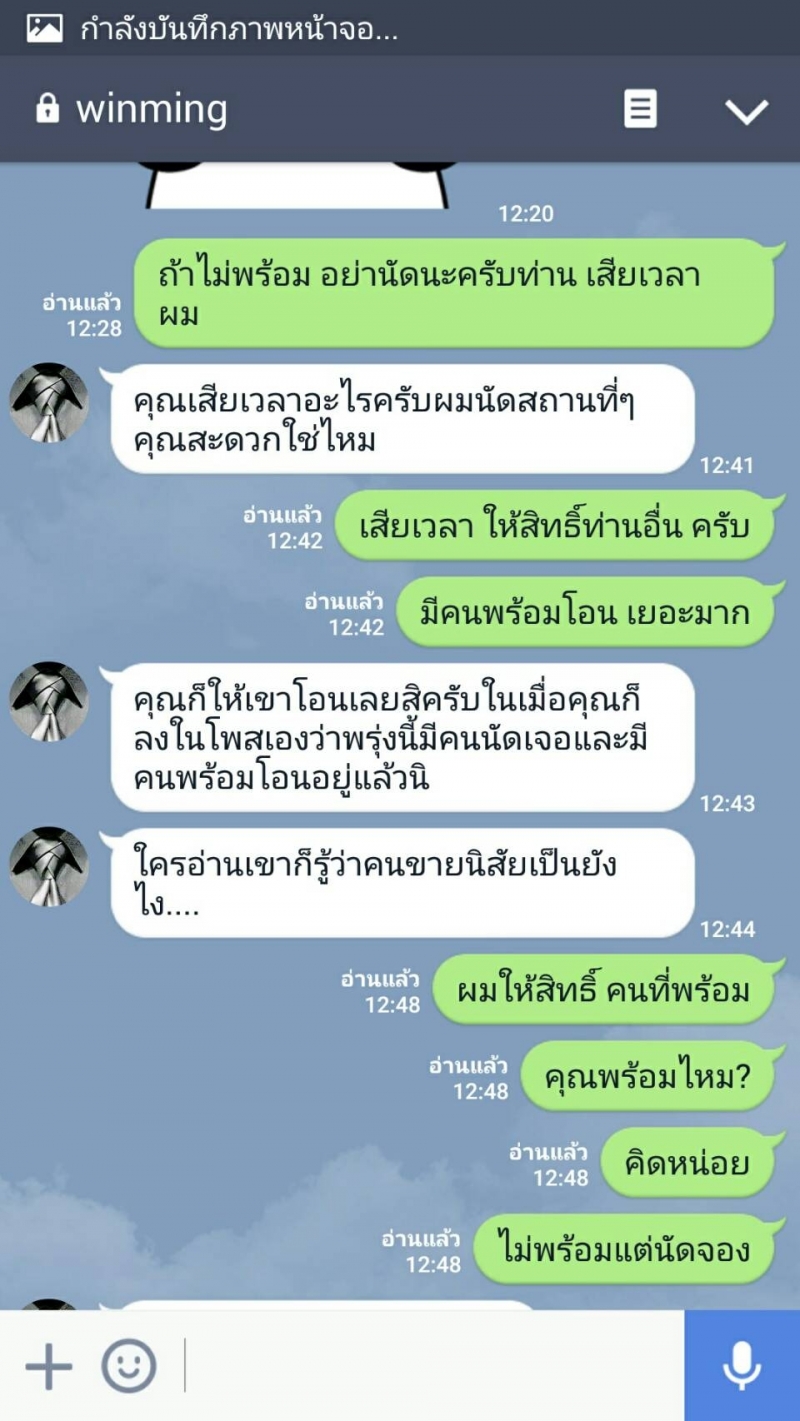 ไอที่คนขายพิมมาบอกไม่พร้อมอย่านัด ถ้าตอบแค่ครับ หรือขอโทษ หรือไม่ตอบอะไรเลยก้ได้ถ้าไม่พอใจ ผมว่าทุกอย่างจบ ทุกอย่างเงียบ ทุกคนกลับไปฟังเพลง win-win ทั้งสองฝ่าย นี่ต้องไปนั่งด่ากันในไลน์ให้เสียอารมณ์นั่งแคปภาพมาด่ากัน หาข้อมูลนั่งนึกนั่งหา ว่าจะด่าจะอะไรเค้าอีกตรงไหน ต้องเข้ามานั่งเช็คมาตอบมาด่า