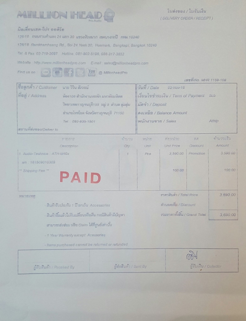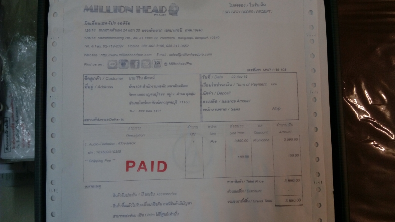 พึ่งซื้อ ATH-M40X มาจาก Million head เมื่อวันที่ 2 ตุลาคม (02/10/59) สภาพใหม่มาก ไม่ค่อยได้ใช้ครับ เพราะหัวผมใหญ่ ใส่แล้วค่อนข้างบีบหัวพอสมควรครับ เลยตัดสินใจปล่อย