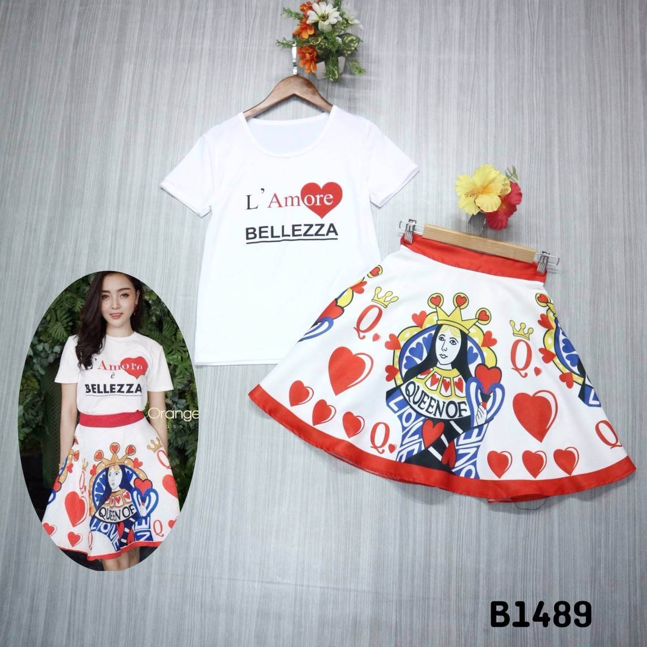 "ยืดแขนสั้นคู่กับกระโปรงพิมพ์ลายไผ่"