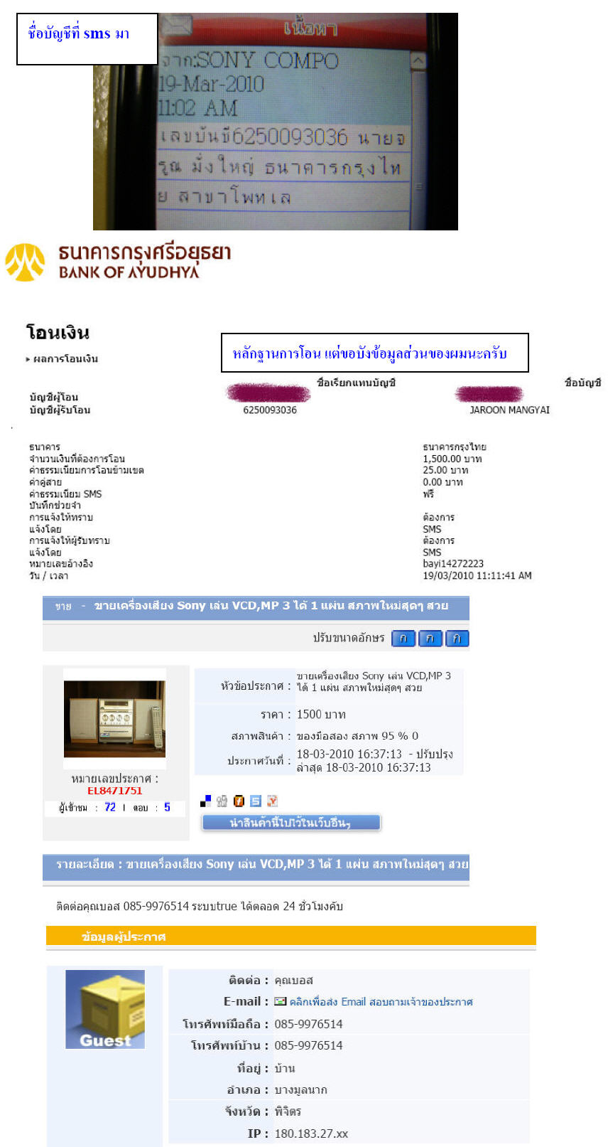 ดังนั้นขอให้ทุกท่านที่ซื้อขายสินค้าผ่าน internet จงระวังไว้ให้ดี มันใช้ชื่อบัญชีธนาคารว่า นายจรูณ มั่งใหญ่ ธ.กรุงไทย เลขที่บัญชี 6250093036