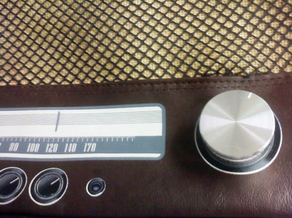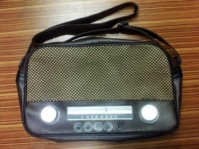 ด้านหน้าของกระเป๋ามีปุ่มปรับลดเสียง ปุ่มปรับหาคลื่น และสกรีนหน้าปัดวิทยุ ดูผ่าน ๆ