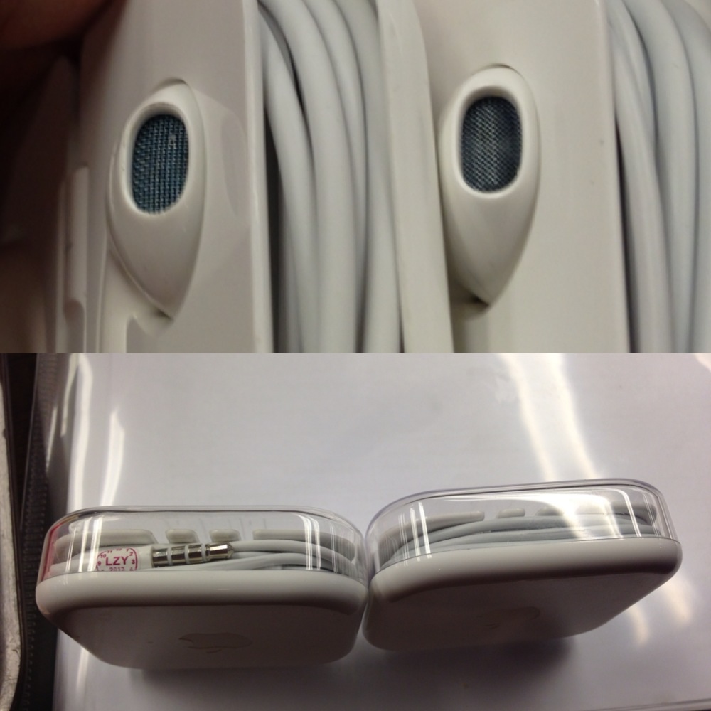 สังเกตุหลักคือของปลอมตะแกลงจะหยาบกว่าและสีจะออกเทาๆของแท้จะละเอียดและสีดำกว่า และของปลอมเวลาม้วนสายแจ็คจะสุดอยู่ที่ด้านล่างส่วนของแท้นั้นสายจะยาวกว่าและแจ็คจะสุดอยู่ที่ด้านข้างของกล่อง