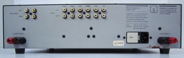 Description: Solid-state integrated amplifier with passive control section. Rated power: 100Wpc into 8 ohms (20dBW), 150Wpc into 4 ohms (18.75dBW). Frequency response: 20Hz–20kHz, ±0.25dB. S/N ratio: 100dB, A-weighted. Input impedance on all inputs: 10k ohms. Input sensitivity: 200mV for full output. Voltage gain at full volume: 43dB. Damping factor: >300.