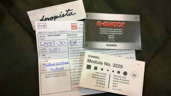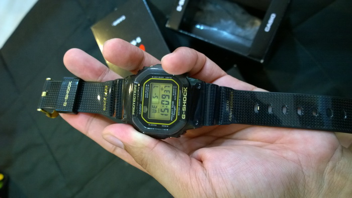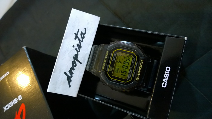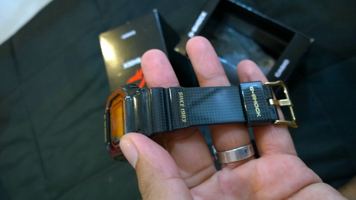 ----------- เรือนแรก G-SHOCK รุ่น DW5030D เป็นลิมิเต่ดครบรอบ 30 ปี ในชุด G SET ไม่มีขายแยก พอดีมีคนซื้อมาเป็นเซทแล้วแยกขาย ผมเลยรีบจัดมาซะ หน้าปัดสีทอง ฝาหลังแบบเกลียวสีทอง ปุ่มทอง ตัวเรือนสีดำใส ประดับด้วยตัวหนังสือและดาวสีทอง สายเป็นคาบอนไฟเบอร์ภายใน รับมาได้ประมาณเดือนนึง ใส่อยู่ไม่น่าเกินสี่ห้าครั้ง