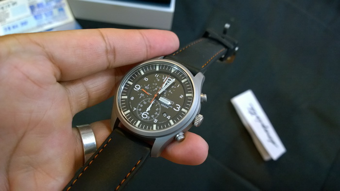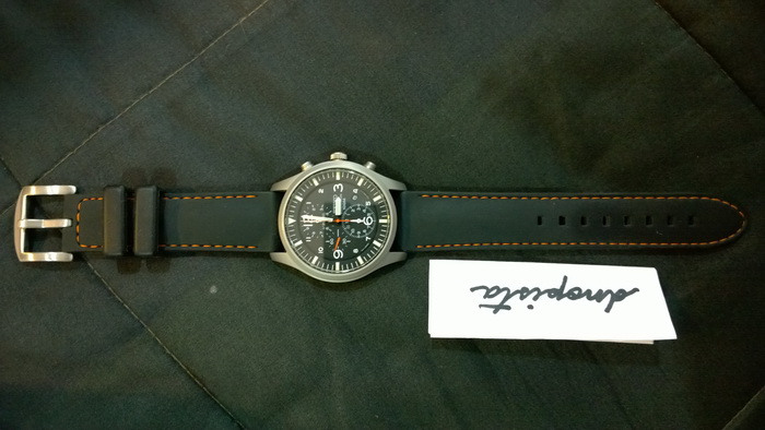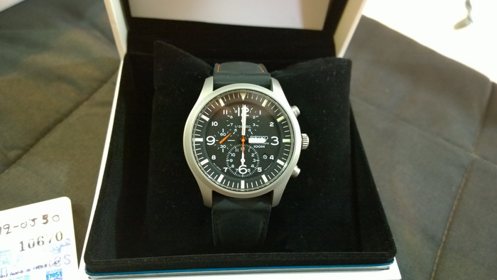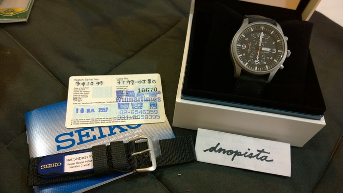 ---------- เรือนที่สองเป็น seiko chronograph รุ่นอะไรไม่รู้ เพราะไม่เคยใช้ seiko สภาพใหม่กริ๊บเช่นกัน ซื้อมาจากร้านแถวโบนันซ่ามาบุญครอง อายุเดือนกว่า ประกันถึง 16 มีนา 58 สายไนล่อนเดิมไม่เคยใช้ เพราะเปลี่ยนสายยางใหม่ทันทีที่ออกจากร้าน