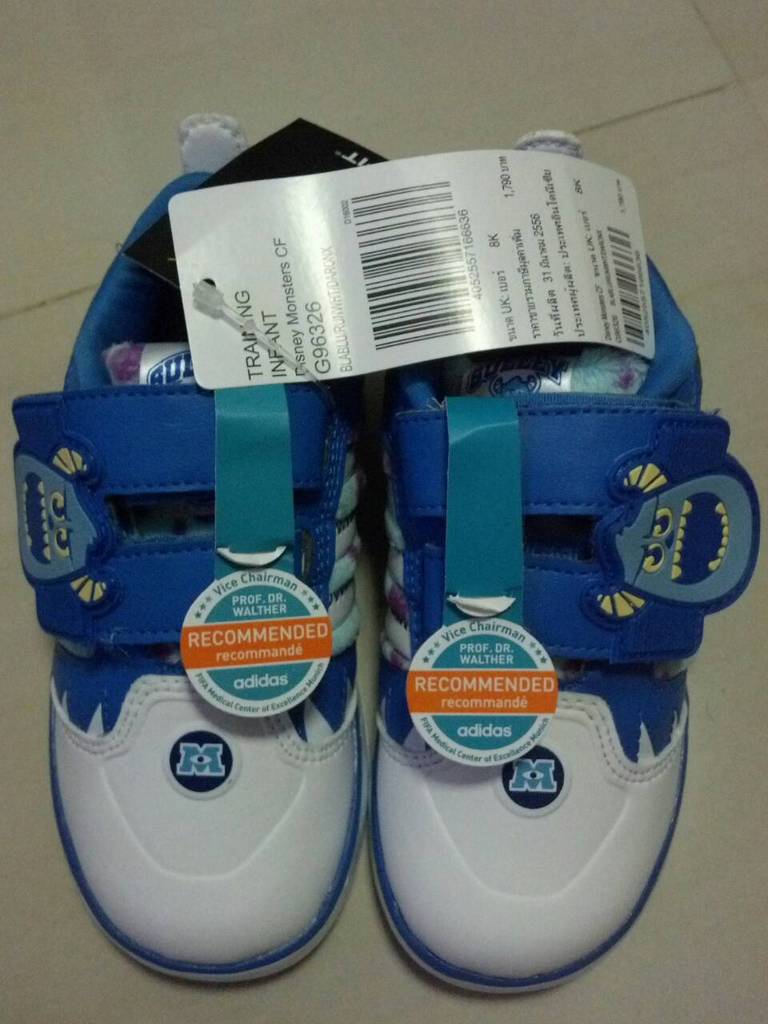เบอร์ 8 (ความยาวของพื้นรองเท้าด้านใน =15 cms) เหมาะสำหรับเด็ก 2-2.5 ขวบ โดยประมาณ (มี Adidas รุ่น Monster University) 890 บาท