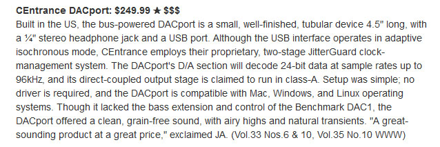 "All was laid clear by the DACport driving my favorite Sennheiser HD-650s, with the clanking stereo sound effects at the beginning pristinely clean, and Lennox's voice sounding natural and free from grain."