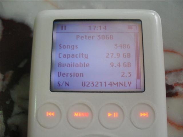 ipod gen3 30GB สภาพสวย มีรอยขนแมวด้านหลัง แบตเล่นต่อเนื่องได้ประมาณ3-4ชั่วโมง มีให้แต่เครื่องเท่านั้น ขาย 1350 บาท