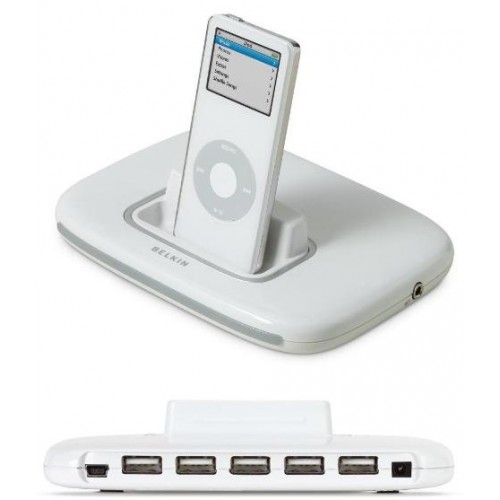 The latest innovation from USB leader Belkin integrates an iPod dock with a five-port USB 2.0 hub. With its slim and elegant design and top-load dock, this product saves your valuable desktop space. It adds a convenient stereo-out jack that lets you listen to your music by connecting your stereo, powered speakers, or headphones while the iPod charges. Designed to work seamlessly with all your USB 1.1 and USB 2.0 devices, the Belkin TuneSync for iPod lets you connect up to five USB 2.0 devices, such as your printer, scanner, hard drive, digital camera, thumb drive, media readers, and more to your computer. LEDs monitor your device activity for master power status and all port activity.