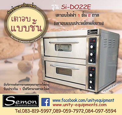 เตาอบไฟฟ้า2ชั้น2ถาด Semon รุ่น Si-DO22E ใช้สำหรับอบขนมหรืออบอาหารชนิดต่างๆ แยกการควบคุมอุณภูมิระหว่างไฟบนและไฟล่าง ภายในติดตั้งหลอดไฟส่องสว่างสำหรับตรวจสอบผลิตภัณฑ์ระบบตั้งเวลาแบบหมุน ภายในเตาอบห่อหุ้มด้วยใยหินทำให้เก็บความร้อนได้ดีและประหยัดไฟ ตัวเครื่องถูกออกแบบมาสำหรับงานหนักทำให้สามารถทำงานต่อเนื่องเป็นเวลานานๆได้