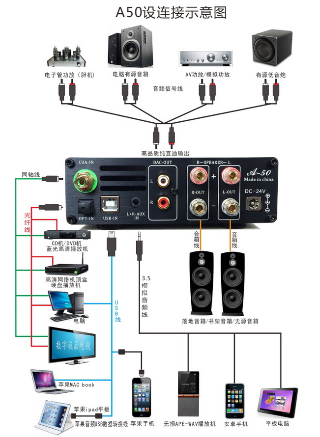 Input : Cox, USB (Support iPhone, iPad, iPod, Macbook, OTG Android),Opitc, AUX 3.5mm.