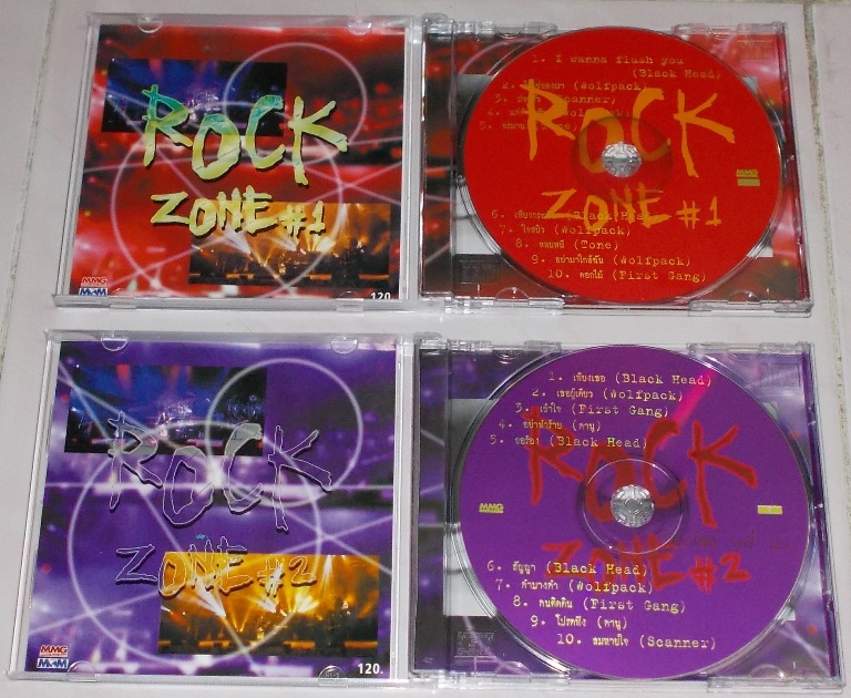 14.Rock Zone 1และ2 ศิลปินเช่นBack head,Wolfpack,Scanner,First gang,Tone,คานู ซีดีเพลงโค๊ตGRII สภาพยังสวยอยู่ ได้หมดทั้ง2แผ่นเพียง 350 ส่ง30