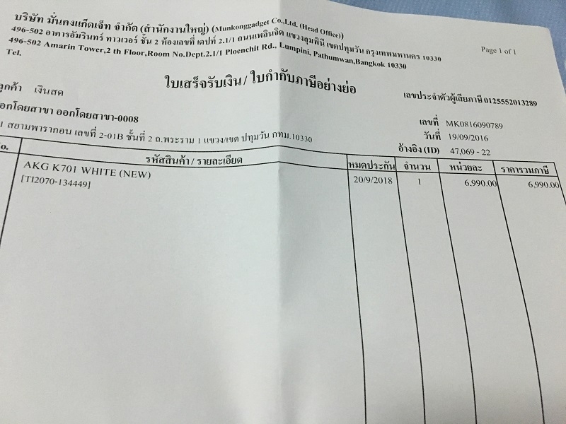 1. หูฟัง AKG K701 สภาพสวยงาม ใช้ไปเดือนกว่า (ซื้อมือหนึ่งร้านมั่นคง วันที่ 19/09/59) เบริน์ได้ เกือบๆ 100 ชม. ไม่ค่อยได้ใช้ฟังเท่าไร