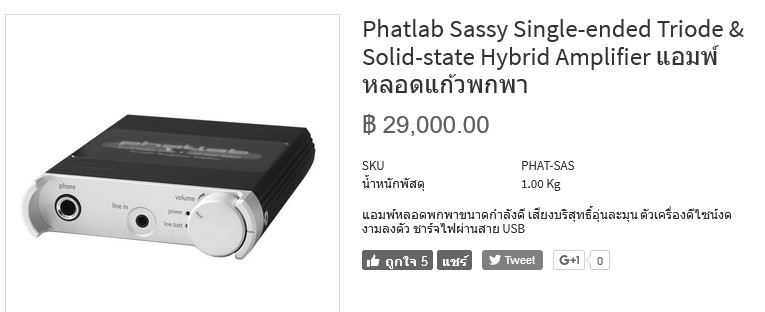 Specifications Frequency Response 10 Hz – 100 kHz Output power 180 mW + 180 mW (300 ohm) 1000 mW + 1000 mW (30 ohm) Headphone impedance 30 ohm – 600 ohm Power supply 5V/1A via micro USB port Operation time (on battery) Approx. 10 hours (depends on headphone impedance) Charging time (>1A supply) Approx. 3 hours Dimensions 119 mm x 93 mm x 23 mm Net weight 270 gram Reviewhttp://www.jaben.co.th/blog/reviews/รีวิว-phatlab-sassy-แอมป์หลอดแบบพกพ/