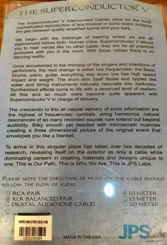 JPS รุ่น Superconductor Vสายสัญญาณจากอเมริกา ขั้วแบบ Balanced XLR ยาว 1 เมตร เป็นรุ่นล่าสุดมาแทน The Superconductor + อันโด่งดัง เสียงสะอาดมากๆ โปร่งเปิดเผย คมชัดจะแจ้งทุกรายละเอียด ปลายเสียงไปได้ยาวไกล เนื้อเสียงโดยรวมละเอียดเนียน ละมุนลื่นไหลต่อเนื่อง ไร้สากเสี้ยน สปีดกลางๆ เน้นความเที่ยงตรงสมจริงเป็นธรรมชาติ มี Total Balance ที่ดีมาก เสียงออกมากลมกล่อมน่าฟัง มิติดี มีเวที มีอิมเมจชัดเจน ช่วยแก้ไขชุดฟังที่เสียงทึบ ไม่สะอาด เบสบวมเป็นก้อน ปลายแหลมกุด รายละเอียดเสียงไม่ชัดเจน มีความกระด้างไม่ลื่นไหล ปัญหาเหล่านี้จะหมดไปครับ