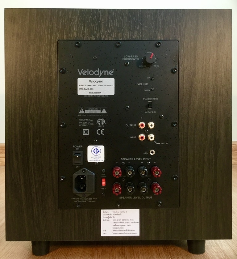 Velodyne รุ่น EQ-Max8 เป็น Subwoofer ขนาด 8 นิ้ว ดอกลำโพงยิงด้านหน้า พอร์ทระบายล่าง สวยเสียงดีเหมาะกับการฟังเพลงมากๆ รุ่นนี้มีไมค์เซทเสียงและรีโมทให้ด้วย เมื่อหาจุดวางเรียบร้อยแล้ว สามารถใช้รีโมทและไมค์เซทเสียง ปรับให้ความถี่ของซับกลมกลืนกับลำโพงคู่หน้า เสียงที่ได้ชัดเจน ถ่ายทอดรายละเอียดของเสียงต่ำได้ดีมาก เบสสะอาดหมดจรด เที่ยงตรงเป็นธรรมชาติ เป็นเสียงต่ำที่มีคุณภาพดีมากๆ เมื่อเซ็ทลงตัวในระบบฟังเพลง 2 Channel เสียงซับจะกลมกลืนและส่งเสริมกับลำโพงคู่หน้าได้อย่างยอดเยี่ยม ไม่รู้สึกถึงการมีอยู่ของ Subwoofer