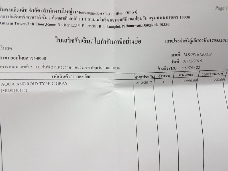 ใช้งานปกติ สภาพดี อุปกรณ์ครบกล่อง มีใบเสร็จร้านมั่นคง ซื้อเมื่อ 01/12/2016