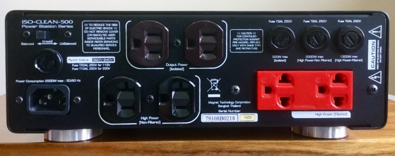 Specs- Isolation Transformer 500VA with Line Coditioner- 2 x Duplex Receptacle (can be upgraded to Oyaide Receptacle)- Minimum Noise Attenuation : -30dB @ 20kHz : -50dB @ 50kHz : -80dB @ 100kHz- Eliminates RF and EMI interference from the AC Line both of common mode and differential noise- 960 Joules maximum surge energy- 2000 W High Power Output (without line coditioning)- Three LED indicated AC line status (power, ground and phase)- 10 mm anodized face plate- Packaged in an artistically massive steel chassis constructed of 1.5 mm thick