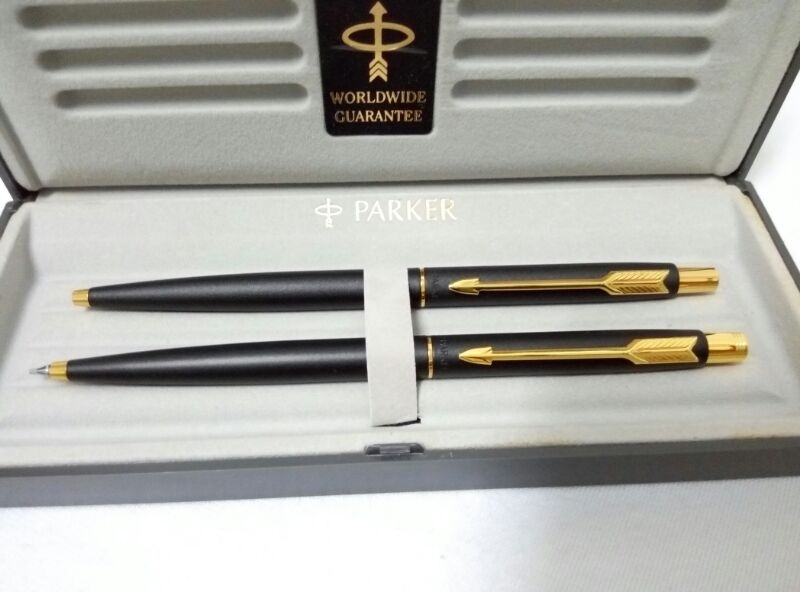 Parker Classic ballpoint pen and mechanical pencil set from the 1980s. Matte black finish with gold plated trim. Made in USA. Both ballpoint and pencil are in like new condition with no signs of usage. In Parker original box.
