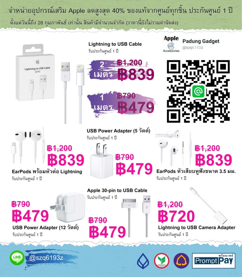 จำหน่ายอุปกรณ์เสริม Apple ลดสูงสุด 40% ของแท้จากศูนย์ทุกชิ้น ประกันศูนย์ 1 ปี