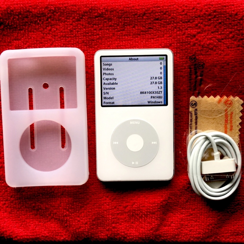 Vintage Apple iPod video 5.th Generation white 30 GB พร้อม สายชาร์จใหม่เอี่ยม เคสซิลิโคน ฟิล์มกันรอย ราคา 3500 บาท