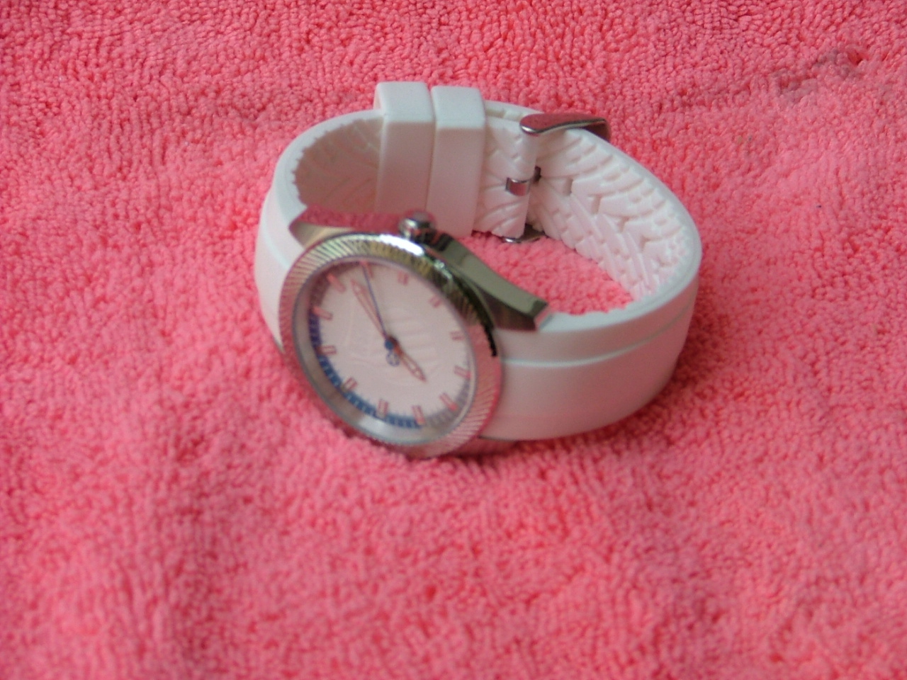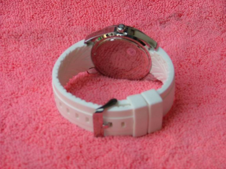 ดีไซน์เรียบหรู สายยางสีขาว แข็งแรงทนทาน หน้าปัดสามมิติแสดงโลโก้ตัวนูน