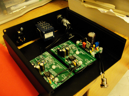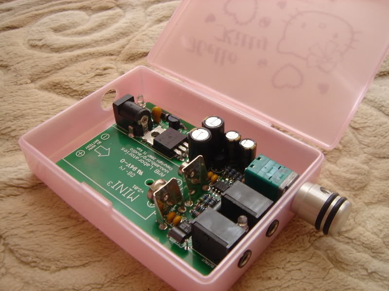 My second build after the SSMH, the balanced Mini3. Both of the Mini3 boards are fed by a TREAD. Power switch is the latching, illuminated Lamptron (pretty much the same as Bulgin), XLR inputs only but I'm using a XLR-RCA converter to use my SE DAC. Pretty nice sounding, little balanced amp I must say. The K1000 is merely for decoration It's driving my balanced PK1s and KSC35s perfectly.