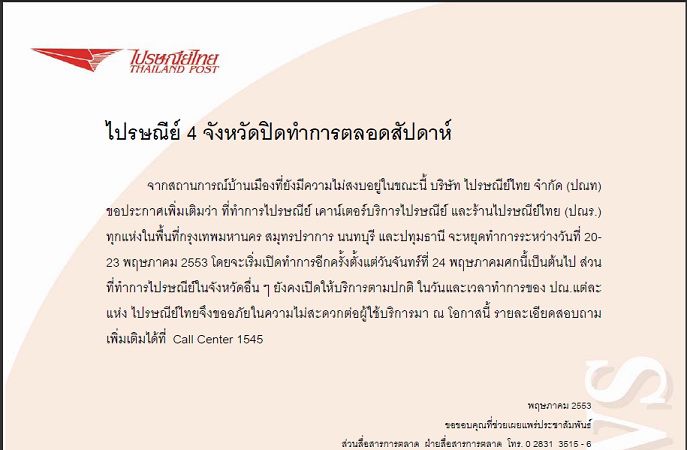 ส่วน ปณ.และจุดให้บริการอื่น ๆ ในพื้นที่กทม.จะเปิดให้บริการรับฝาก และนำจ่ายไปรษณียภัณฑ์ รวมทั้งบริการการเงินตามปกติตั้งแต่วันพรุ่งนี้ (19 พ.ค.) เป็นต้นไป หากมีการเปลี่ยนแปลงใด ๆ จะแจ้งให้ทราบอีกครั้งผ่านสื่อมวลชน หรือสอบถามเพิ่มเติมได้ที่ Call Center