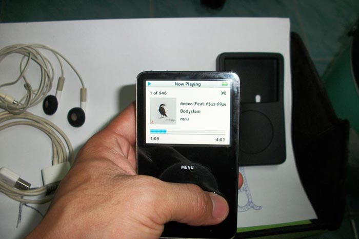 1.iPod Video 30gb สีดำ ด้านหน้าสวยครับ แต่คลิกวีลมีรอยหน่อย ด้านหน้าติดฟิล์มแต่ไม่ได้ติดที่คลิกวีลครับ คือเคยติดแล้วมันหลุดก็เลยขี้เกียจติดแล้ว ส่วนด้านหลังมีรอย แต่เป็นรอยบนฟิล์มกันรอยครับ เป็นฟิล์มแข็ง ลอกออกก็เนี๊ยบ ฮาร์ดดิสดีไม่มีแบด แบตยังดีครับ 5-6ชม.ขึ้น ฟังแต่ Lossless ครับ มีสายซิ้งค์แท้ กับหูแท้ครับ แต่หูฟังด้านขวาเสียงมันเริ่มแตกครับ