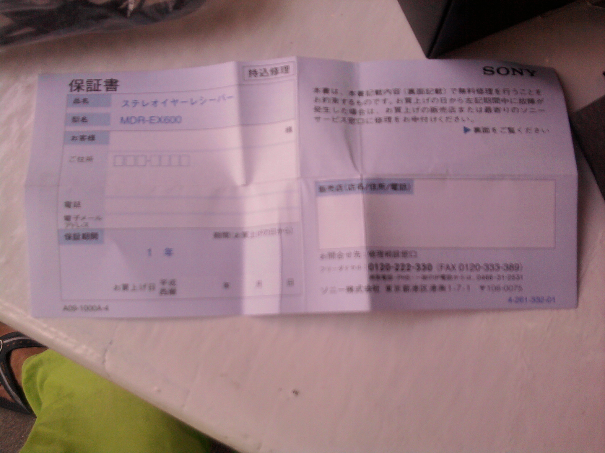 2.MDR EX600 ซื้อมาจากห้าง Midori ที่ โอซาก้า เมื่อ17/10/2010 ได้มาราวๆ8500บาทครับ(19800เยน+ภาษี) อุปกรณ์มีกล่องเก็บหูฟัง จุกยาง 7คู่ สายสำหรับเปลี่ยนทั้งยาวและสั้น ยกกล่องให้ไปเลยครับ สภาพ มีตำหนิตรงหูด้านขวาเล็กน้อย(ไม่รู้โดนอะไร แต่มองไม่ค่อยเห็นครับ) ขาย5500(เผื่อต่อ)