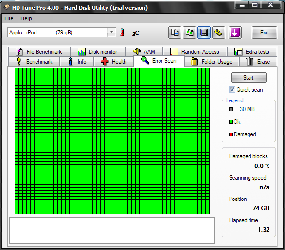 เสียบ iPod คอมฯ --> เปิด HDTune --> เลือกฮาร์ดดิสที่จะสแกน (iPod) --> เลือก errer scan --> กด Start --> กด Save (ที่เป็นรูปแผ่นดิส) เสร็จล่ะ
